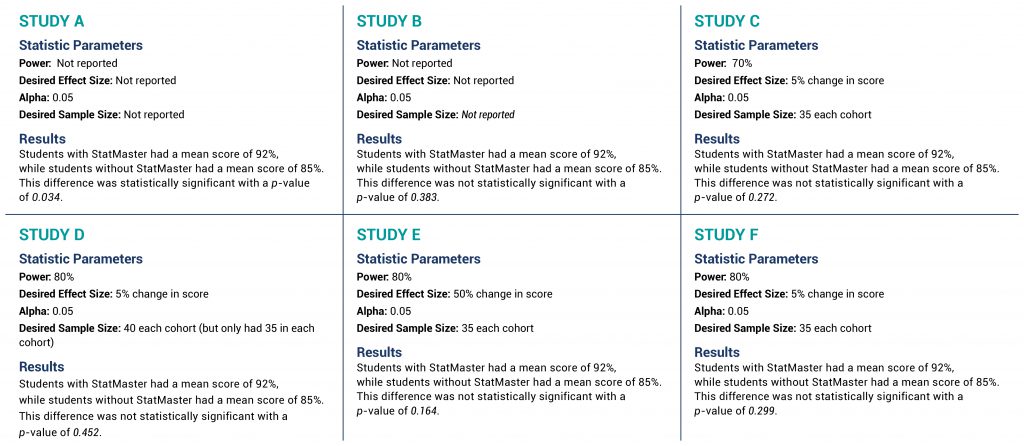 While a 50% change in score would be of interest, it has two problems. First, it is likely that previous course offerings provide some estimate of performance in the absence of StatMaster, and—presuming it is even remotely close to the mean of 85% seen in Study E—a 50% increase would not be mathematically possible, making this an impractical effect size. Second, a sample size will provide adequate power to detect an effect size that is at least as big as the desired effect size or bigger, but not smaller. Reviewing the equation earlier in this manuscript provides the mathematical evidence of this concept.