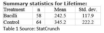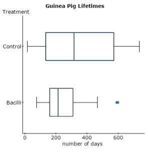 Dotplots and boxplots of the data reveal differences. Lifetimes in the bacilli group tended to be shorter and displayed less variation than the control group. The dotplot for the control group raised a question of bimodality (an observation that experts are likely better able to clarify). The lifespans of guinea pigs treated with bacilli display a marked right skew, with a couple long-lived outliers. It seems there is something different in the groups of guinea pigs. Hence, the question: Do treated guinea pigs tend to live for a shorter number of days?