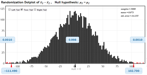 The p-value, however, is right before our very eyes. Using the “two-tail” option, Display 5 shows those dots from the randomizations “at least as extreme as the one in the sample” colored red, and the computed proportion of these extreme values among all the 5010 randomizations (p-value ≈ 0.001 + 0.001 = 0.002 for this example).