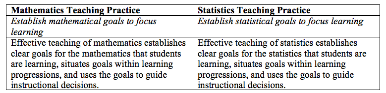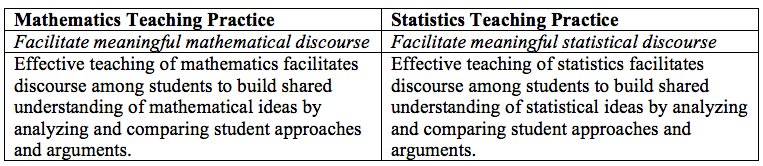As a mathematics teacher educator, I promote these practices and use them in my content classrooms for pre- and in-service teachers. However, as I reflected on how I would use these in my statistics content course for secondary mathematics teachers, I noticed many of the practices do not look the same when implemented in a statistics classroom. This made me wonder how these practices might look differently when the focus is on statistics.