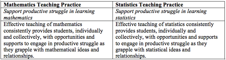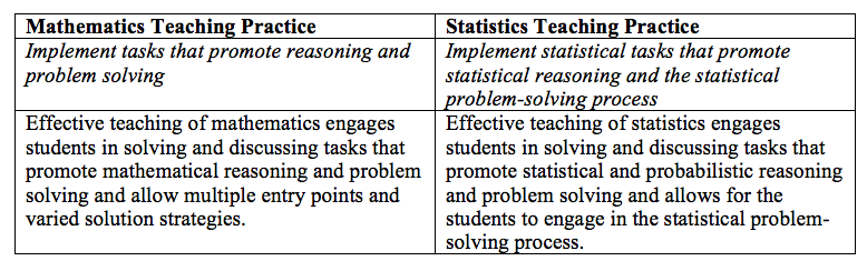 The MTPs represent eight research-based teaching practices that engage students in rigorous and robust mathematics. Similarly, the STPs presented summarize instructional practices we can use in our classrooms to engage students in rigorous and robust mathematics. Being explicit in describing what these STPs are and detailing how they are different from and similar to the MTPs is important, as it helps us understand how the statistics classroom looks different than the mathematics classroom.