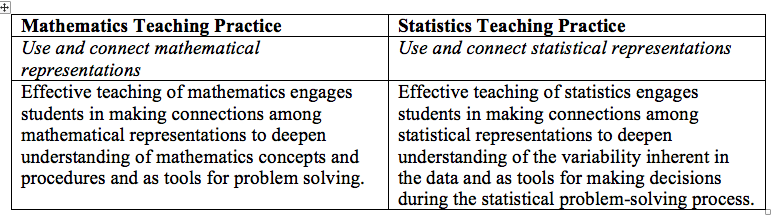 Many would agree that mathematical representations often appear in statistics. However, the difference in these two teaching practices is in how the representations are used and in what the goal is for using them. Students in a statistics classroom must not only be able to create the graphical representation, but also select the most appropriate graphical representation for a particular data set that effectively portrays or describes the variability in the data and helps in answering the statistical question at hand.