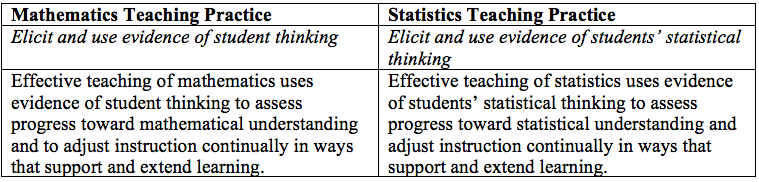 The primary difference between these two practices is in what types of thinking are elicited in the classroom. In the statistics classroom, teachers should focus on eliciting statistical thinking, not mathematical thinking. For example, when students are analyzing a data set, they may decide to calculate various statistics to help them describe the data. Students who share their mathematical thinking would present how they found those statistics (e.g., “I added all the data points and divided by how many data points there were.”). In contrast, students who share their statistical thinking would present why they decided to calculate a certain statistic in lieu of another or how the various statistics tell us different information about the data set. Engaging in this practice requires that we know what statistical thinking needs to be elicited to achieve the learning goal for the lesson.