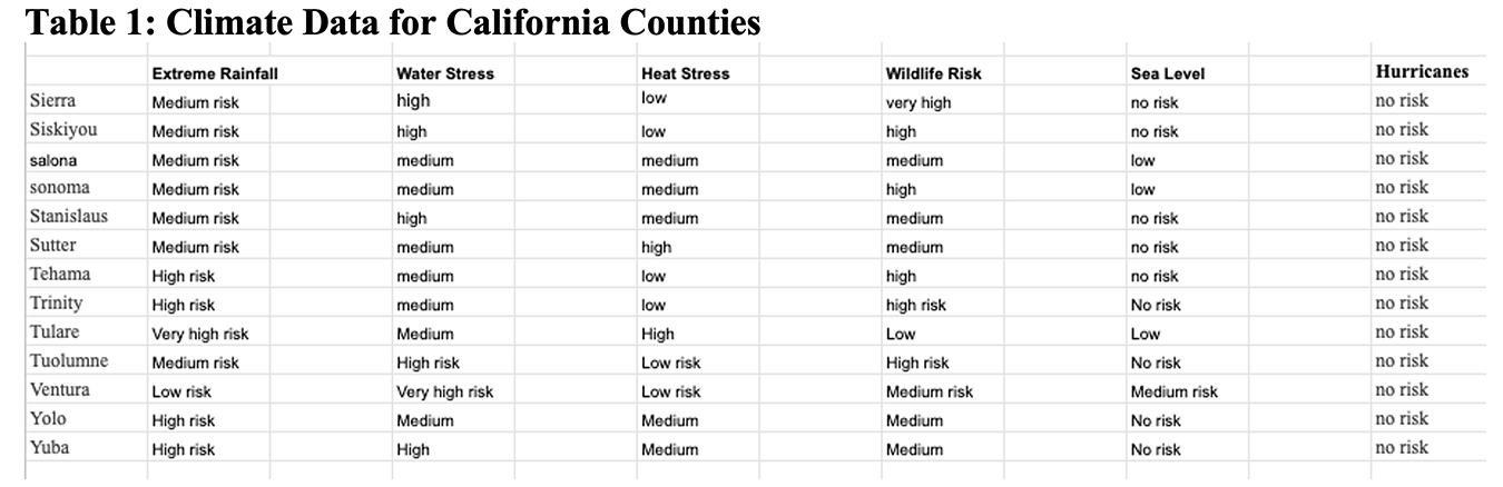 Day 3. On the last day of inquiry, students were asked to dive deeper into climate change in their community, not just their region, and create a data set showing the different climate threats and degree of threat. Gralnik assigned each group 10 counties in California (the location of the community in which they were in) and asked them to use the map to collect data on those counties. Table 1 is an example spreadsheet created by students.