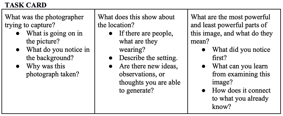 Photography Inquiry Center—Objective: Critically observe a photograph, ask questions, and interpret ideas.