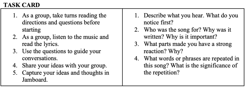 Music—Objective: Listen to music and connect to a time and place where you step into the lives and experiences of others.