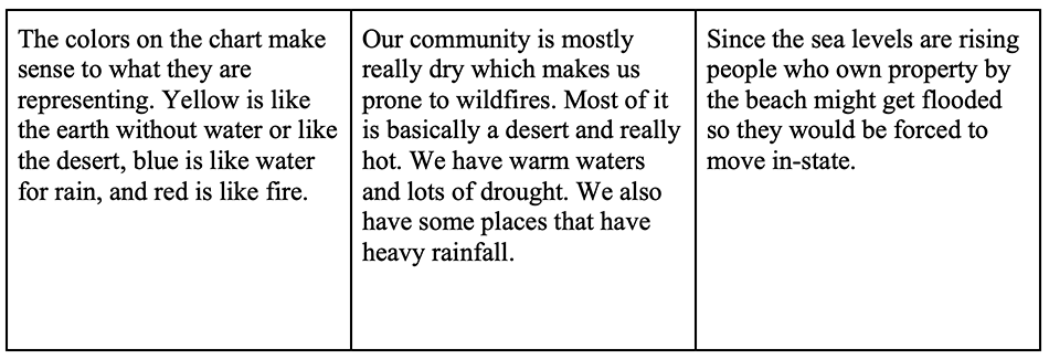 The goal of this investigation is to use data to deepen ideas and gain insight into climate change. Students analyzed the map of the United States and used multiple perspectives to interpret it. Students were scaffolded to reflect their prior knowledge and connection to new information presented on the map. Throughout the investigation, students developed questions they wanted to investigate based on what they observed. They were no longer merely looking at the United States map but investigating the cause and effect of climate change and asking questions.