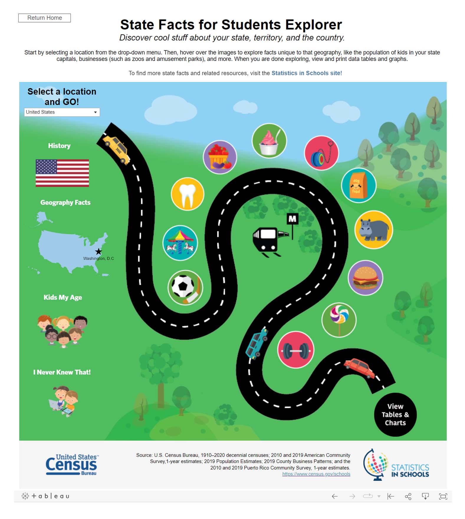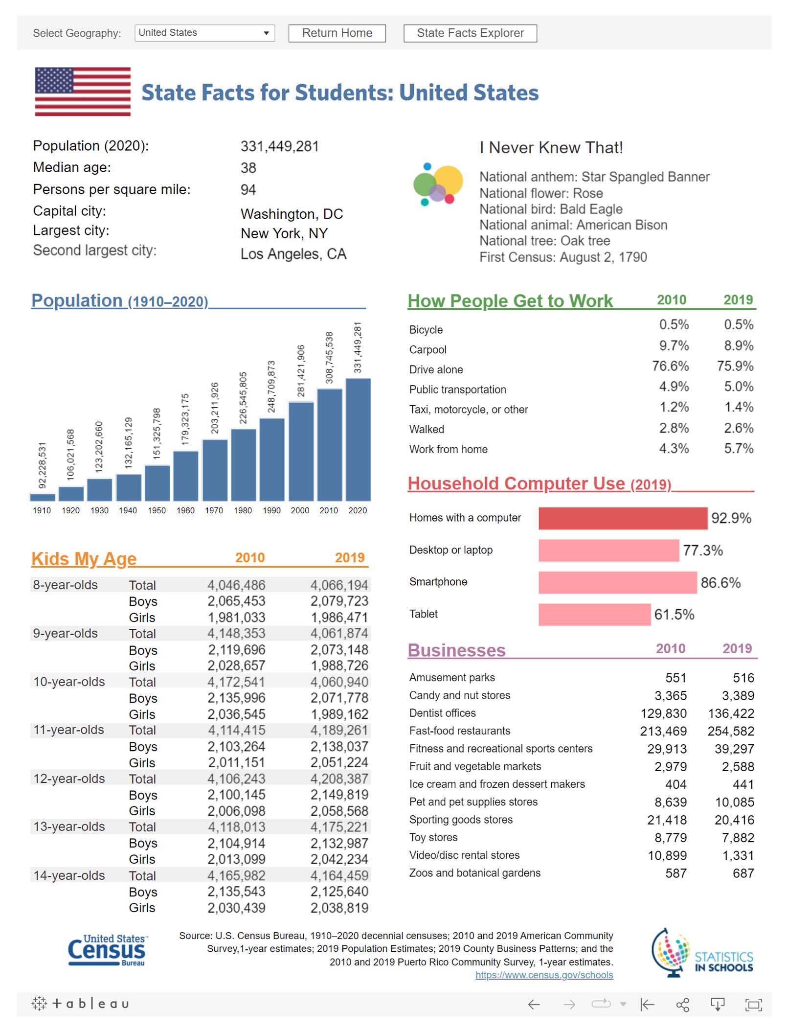 The Census Bureau also offers State Facts for Students, a data access tool geared toward younger students. This tool helps students discover fun facts about their state such as the change in its population from 1910 through 2020, the population of kids their ages, how people get to work, businesses there, and household computer use. It was recently refreshed and now provides multiple ways to examine the data through interactive data visualizations and tables. The familiar table view presents the data in a simple-to-use format that allows students to review and compare new and old data.