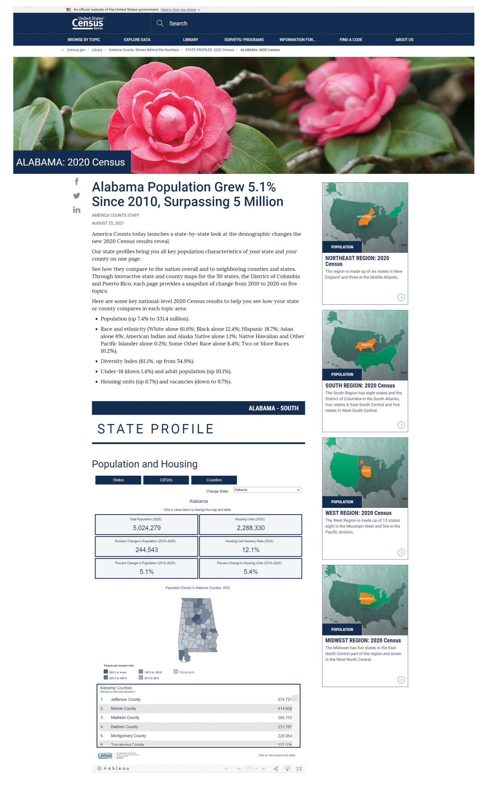 Pages can be easily shared and include multiple visualizations, so you view data through population density maps, bar charts, and more. You can also compare data points to 2010 Census results to see how your state or county changed over the decade.