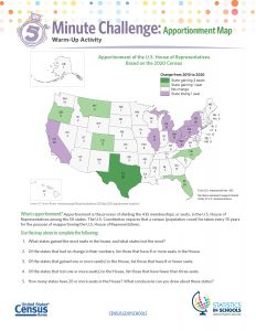 Once each decennial census ends, the results are used to calculate the number of seats each state is entitled to in the US House of Representatives based on its population. Each of the 50 states is entitled to a minimum of one seat. You can share more about the 2020 apportionment results with a five-minute warm-up challenge during which students examine an apportionment map and answer questions about their findings.