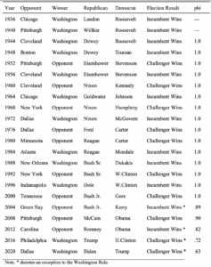 More recently, Fans, Football, and Federal Elections: A Real-World Example of Statistics, and ‘Redskins Rule’: MNF’s Hirdt on Intersection of Football & Politics reviewed the relationship between the winners of the United States presidential election in November and the most recent Washington Commanders’ home game (known as the “Washington Rule”). Since the inception of the franchise (originally the Boston Redskins in 1932), the incumbent party (Republican or Democrat) maintains control of the White House if Washington wins their most recent home game prior to the election, but a Washington loss implies a power transition by January 20. This pattern began in 1936 and continued unbroken (phi coefficient = 1.0) until the November 2004 election, when the victors from Green Bay would have predicted a presidential win for John Kerry (Democrat challenger).